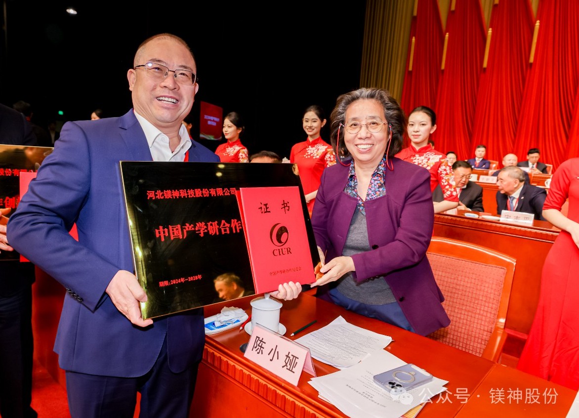 3月17日,以“產學研聚焦:新動能、新模式、新產業(yè)”為主題的第十五屆中國產學研合作創(chuàng)新大會在北京會議中心隆重召開,河北鎂神科技股份有限公司董事長孫文受邀出席。會議表彰了2023年在產學研深度融合方面做出貢獻的先進單位和個人,河北鎂神科技股份有限公司榮獲“中國產學研合作創(chuàng)新示范企業(yè)”,中國產學研合作促進會特聘專家、科技部原副部長陳小婭為我司頒發(fā)榮譽證書。
