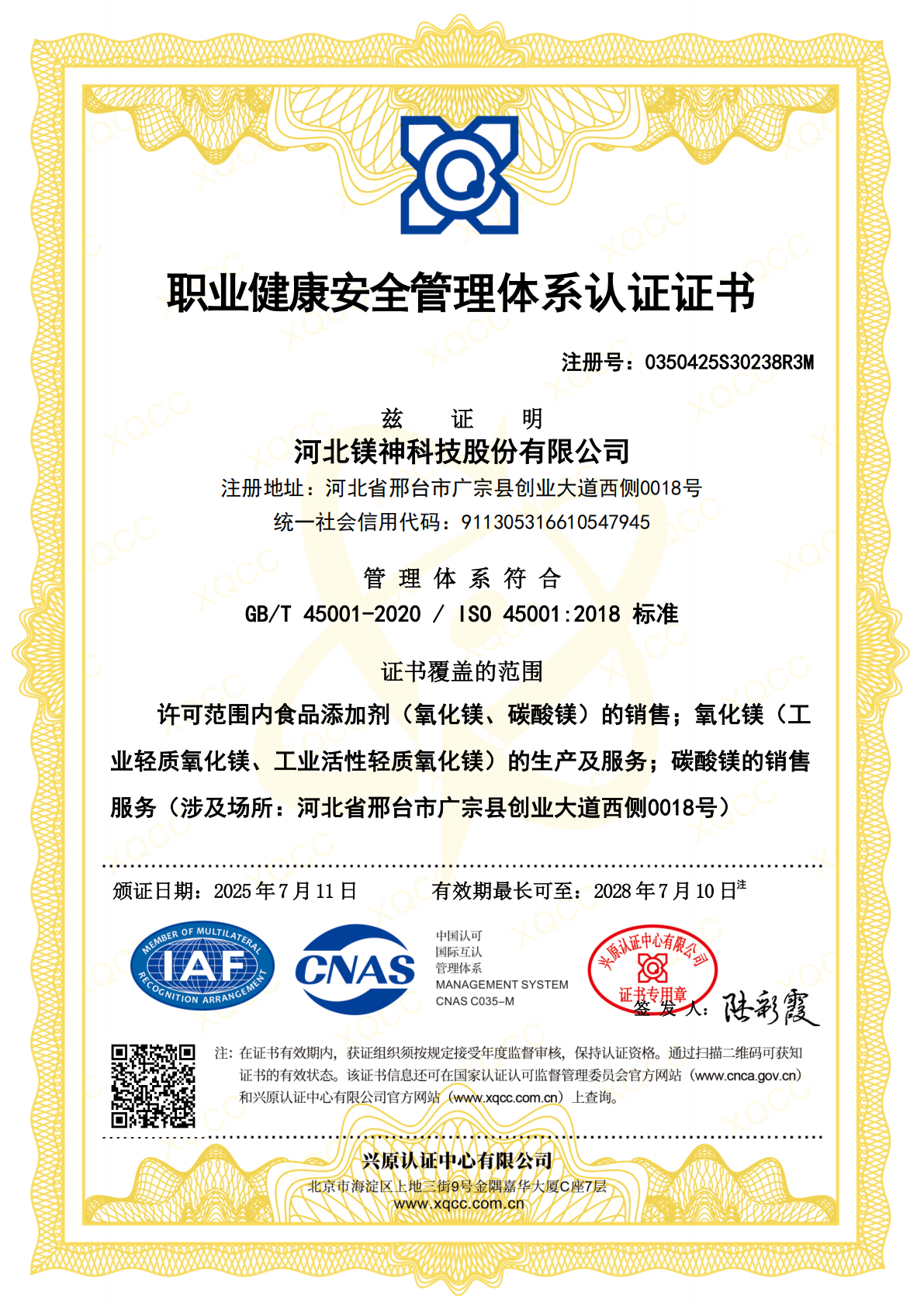 職業(yè)健康安全管理體系認(rèn)證證書